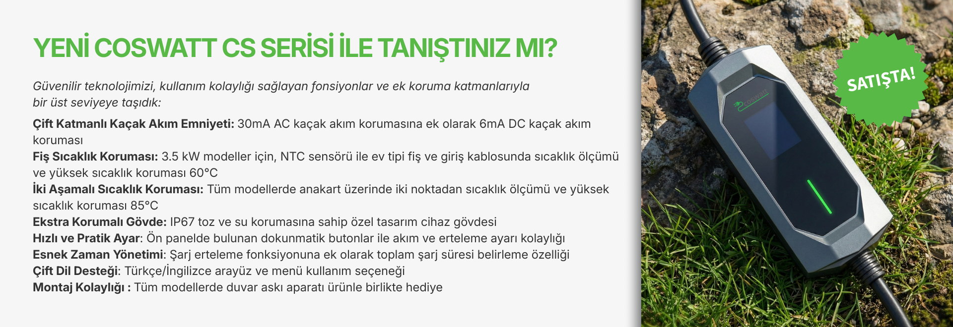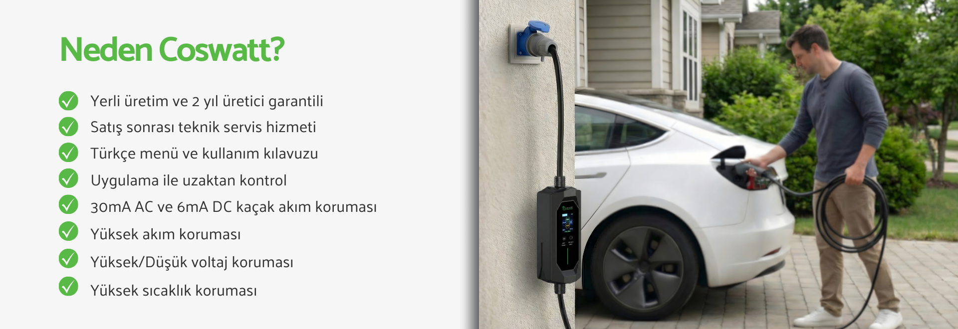 Coswatt ürünleri, Türkiye’de elektrikli araç şarj teknolojileri alanında uzmanlaşmış Cosmosparts’ın mühendislik altyapısı ve teknik deneyimiyle geliştirilir. Üretimden kalite kontrol süreçlerine kadar her aşamada yerli üretimin sağladığı güven ve uluslararası standartlara uygunluk ön planda tutulur. Elektrikli araç sahiplerine güvenli, pratik ve erişilebilir şarj çözümleri sunmak Coswatt’ın temel yaklaşımıdır; bu yaklaşım, sürdürülebilir enerji kullanımını destekleyen ve daha verimli bir mobilite anlayışıyla şekillenir. Ürün yelpazesi; taşınabilir elektrikli araç şarj cihazları, Tip-2 şarj kabloları ve dönüştürücü adaptörlerden oluşur. Coswatt olarak güvenilirlik, dayanıklılık ve kullanıcı memnuniyeti odağımızın merkezinde yer alır. Elektikli araç şarj teknolojilerinin geleceğini bugünden deneyimlemek isteyen herkesi Coswatt çözümleriyle tanışmaya davet ediyoruz.