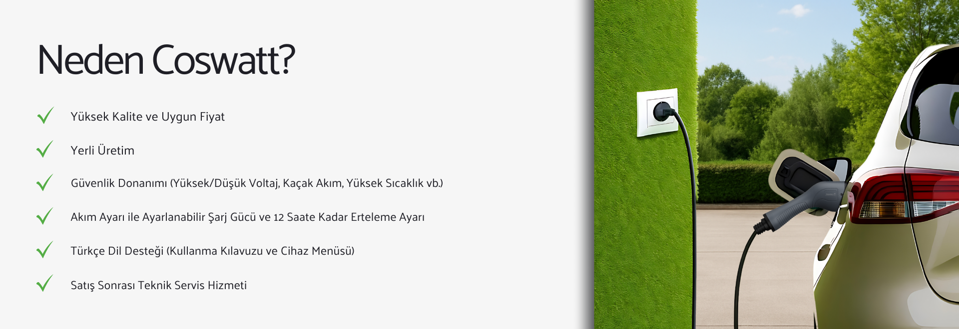 Coswatt ürünleri, Türkiye’de elektrikli araç şarj teknolojileri alanında uzmanlaşmış Cosmosparts’ın mühendislik altyapısı ve teknik deneyimiyle geliştirilir. Üretimden kalite kontrol süreçlerine kadar her aşamada yerli üretimin sağladığı güven ve uluslararası standartlara uygunluk ön planda tutulur. Elektrikli araç sahiplerine güvenli, pratik ve erişilebilir şarj çözümleri sunmak Coswatt’ın temel yaklaşımıdır; bu yaklaşım, sürdürülebilir enerji kullanımını destekleyen ve daha verimli bir mobilite anlayışıyla şekillenir. Ürün yelpazesi; taşınabilir elektrikli araç şarj cihazları, Tip-2 şarj kabloları ve dönüştürücü adaptörlerden oluşur. Coswatt olarak güvenilirlik, dayanıklılık ve kullanıcı memnuniyeti odağımızın merkezinde yer alır. Elektrikli mobilitenin geleceğini bugünden deneyimlemek isteyen herkesi Coswatt çözümleriyle tanışmaya davet ediyoruz.