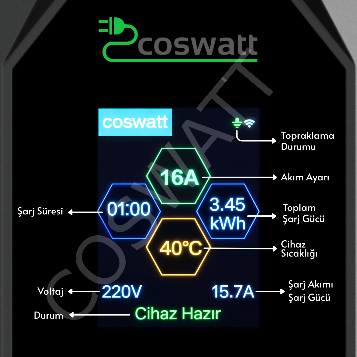 - Dijital Ekran: Anlık ve toplam şarj değerleri, şarj süresi, voltaj, işlemci sıcaklığı, topraklama ve hata durum bilgilerini anlık takip edin.