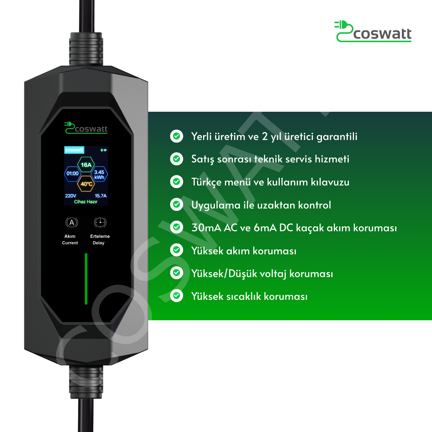 Coswatt Taşınabilir EV Şarj Cihazı CS-P1-16A / 3.5kW / 10M / Türkçe Menü / 220V AC / Tip-2 Soket / 2x16A Ev Tipi Fiş / Taşıma Çantası
