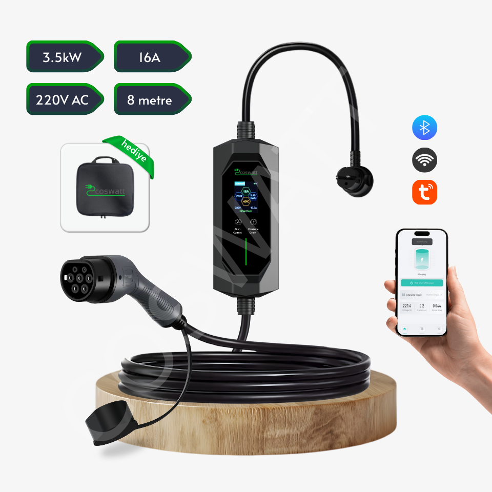 Coswatt Taşınabilir EV Şarj Cihazı CS-P1-16A / 3.5kW / 8M / Türkçe Menü / 220V AC / 2x16A Ev Tipi Fiş / Taşıma Çantası