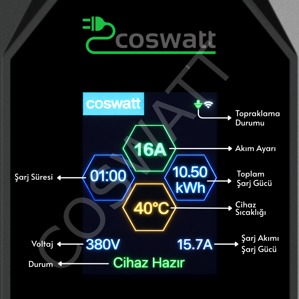 - Dijital Ekran: Anlık ve toplam şarj değerleri, şarj süresi, voltaj, işlemci sıcaklığı, topraklama ve hata durum bilgilerini anlık takip edin.