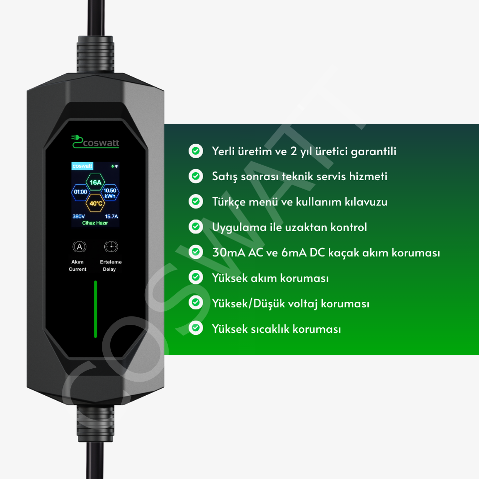 Coswatt Taşınabilir EV Şarj Cihazı CS-P3-16A / 11kW / 8M / Türkçe Menü / 380V AC / Tip-2 Soket / 5x16A CEE Fiş / Ev Tipi Priz Adaptörü / Taşıma Çantası