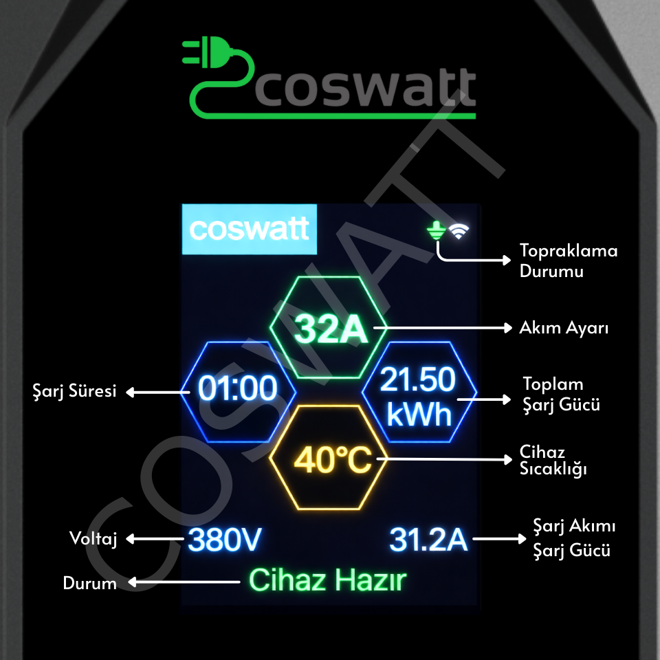 - Dijital Ekran: Anlık ve toplam şarj değerleri, şarj süresi, voltaj, işlemci sıcaklığı, topraklama ve hata durum bilgilerini anlık takip edin.